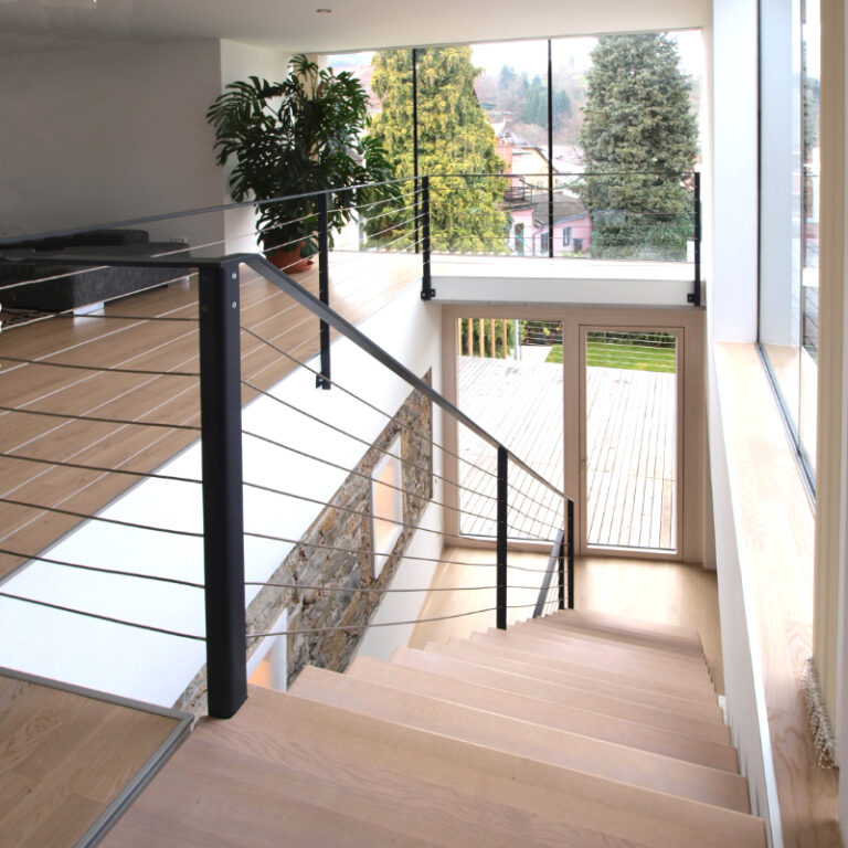 Durch die Dachgeschoßerweiterung wird der zusätzliche Raumbedarf abgedeckt und die Aussichten vom Erweiterungsbaukörper optimiert. Der neue Stiegenaufgang strukturiert die Nutzungsbereiche und bringt Sonnenlicht tief in das Gebäude.
